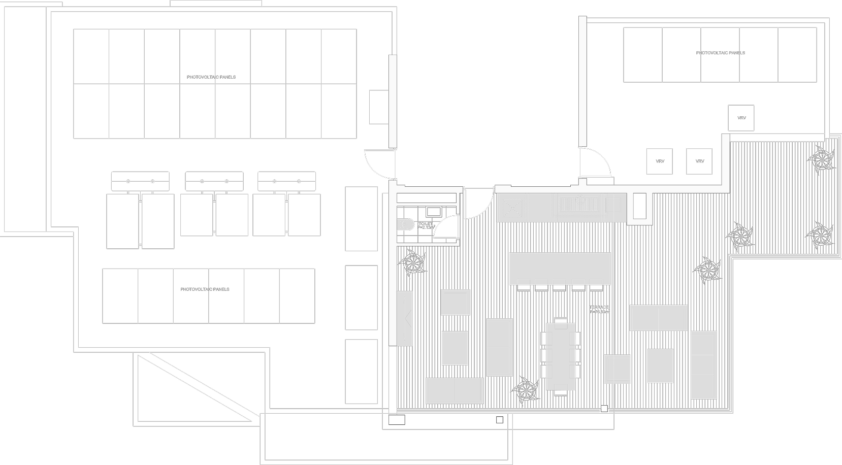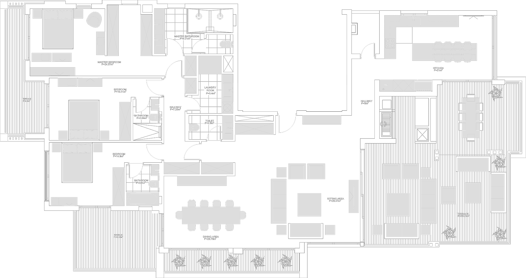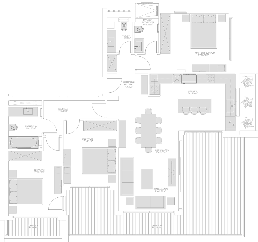 The first level hosts two spacious three-bedroom apartments (213 m² each) with thoughtfully planned layouts and generous balconies. Above them, the penthouse spans the entire top floor (376,91 m²), with four bedrooms, a vast terrace, and a private rooftop featuring its own kitchen and lounge.